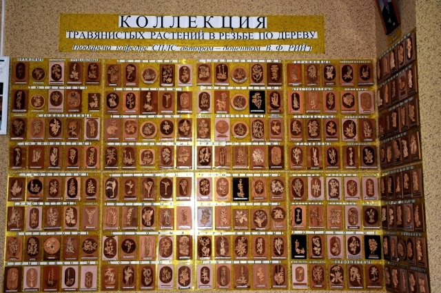 Большой ценностью для нас является ещё дореволюционная энтомологическая коллекция вредителей леса. Она побывала в эвакуации. И её сохранили в хорошем состоянии. Есть в вузе ещё одна уникальная вещь – резной гербарий. Его создатель – замечательнейший человек и любимейший студентами-лесниками преподаватель Валерий Фёдорович Рий. Он был одним из ведущих специалистов по физиологии растений Советского Союза, соавтором многих учебников. Валерий Фёдорович из рода резчиков по дереву. Он как уникальный резчик по дереву, как специалист в ботанике, из дерева вырезал гербарий – больше 100 видов травянистых растений.