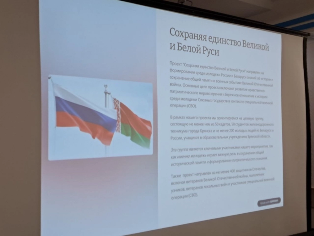 "Презентуем инициативу "Сохранение Великой и Белой Руси", поддержанную Президентским фондом культурных инициатив. Воплощать в жизнь эту значительную программу будем рука об руку с товарищами из Республики Беларусь. Объединяющая цель — сплочение молодежи и поддержание культурного наследия родственных наций."